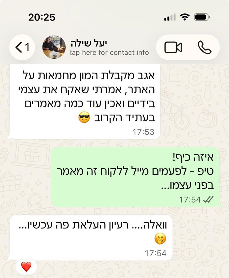 אנשים נפלאים מגיעים אלי, בהתחלה חוששים, לא בטוחים, לא יודעים, ואז משתפים אותי בחששות וסומכים עלי בתהליך ובזכות זה יחד אנחנו מגיעים לתוצאות מושלמות.