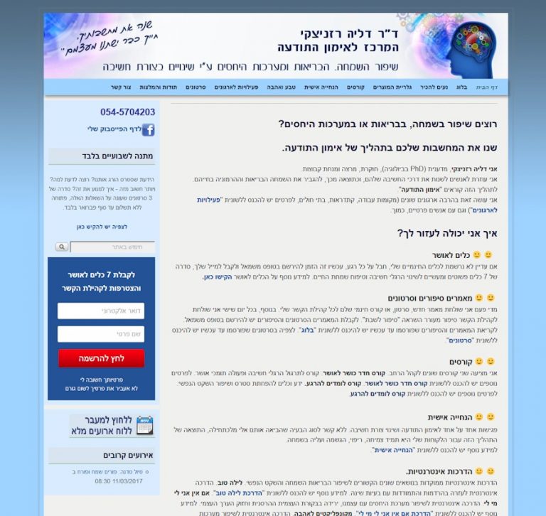 אחרי שנים של היכרות אינטרנטית במסגרות שונות, יום אחד דליה התקשרה וביקשה ואעזור לה לבנות אתר. היא ידעה להגיד לי שכחול הוא הצבע המועדף עליה, יש כמה נתונים שבורורים לה לגבי האתר, ואחרים נתונים לעיצוב, שינוי, הוספה ומה שמתאים בעיני. באותה נשימה ביקשה גם מקום לשים את הקורסים שהיא מעבירה, ותוך כדי שיחה הבנו שלא כדאי לחבר הכל באותו מקום, עדיף לבנות אתר נפרד לקורסים, שיכיל תכונות מיוחדות של הרשמה וחשיפת תוכן, על ידי הטמעת תוסף משוכלל שמאפשר לשים קורסים און-ליין וקישור לתשלום, דיוור ועוד, כך שהאתר הנוסף הופך להיות בית ספר קטן פרטי שלה, עם שליטה מלאה על הכל.