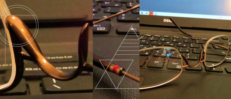 ממש נגיעה, בחיבור שבין החלקים נעשה עיצוב שמתייחס לחיבור בין חומרים, בין עובי שונה ובין פונקציה שונה – המוט נועד רק להאריך את המשקפיים ולהיות קל כלל האפשר, לכן הוא דק וקל, לעומת החלק שנשען על האוזניים ונועד להיות נוח ורחב יותר. החיבור בין שניהם מהווה אתגר עיצובי שלא חשבתי עליו.