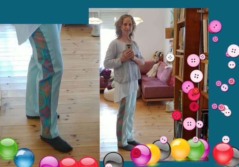 לקינוח, הנה מה שהזכרתי לי יום – שאני אוהבת לתפור ושבא לי מכנסיים אבל לא סקיני, אז מצורפת תמונה של התוצר הגולמי שמחזיר אותי לחיוכים שלי – הרחבתי את המכנסיים הסקיני הצמודים החונקים והפכתי אותם למשהו נוח להפליא (כמו שעשיתי בשנות ה-70 אבל בלי להרחיב למטה יותר מדי) ועכשיו מצחיק לי, נוח ומחוייך, ואולי פתחתי אופנה חדשה 😀